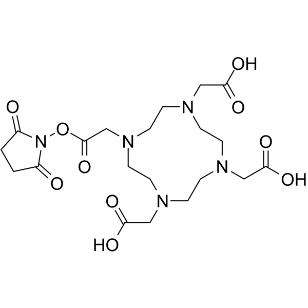 DescriptionDOTA-NHS-ester is a linker for affibody molecules and is applied in small animals PET, SPECT, and CT. DOTA-NHS-ester can be used to label radiotherapeutic agents or imaging probes for the detection of tumors.(In Vitro):DOTA-NHS-ester can be used to modify human serum albumin (HSA) to produce DOTA-HSA. And DOTA-HSA is furtherly modified by Sulfo-SMCC to obtain DOTA-HSA-SMCC. DOTA-HSA-SMCC is conjugated to ZHER2:342 and the final product is DOTA-HSA-ZHER2:342. In a cell uptake assay, DOTA-HSA-ZHER2:342 is labeled by 64Cu, 64Cu-DOTA-HSA-ZHER2:342 (0.5-2 hours) slowly accumulates in the SKOV3 cells and reaches 0.71% of the applied activity at 0.5 h and the uptake increased to 1.58% at 2 h.(In Vivo):In a microPET images of a mouse bearing SKOV3 tumor, 64Cu-DOTA-HSA-ZHER2:342 is injected to the mouse tail. microPET images of a mouse bearing SKOV3 tumor at 1, 4, 24 and 48 h after tail vein injection.The SKOV3 tumor is visible with a low tumor-to-background contrast at 1 h post-injection (p.i.), but with a very good tumor-to-background contrast at 4 and 24 h p.i.Quantification analysis reveals that the SKOV3 tumor uptake values increases with time and are found to be 5.63%, 9.98%, 14.34% and 14.12% ID/g at 1, 4, 24, and 48 h, respectively.