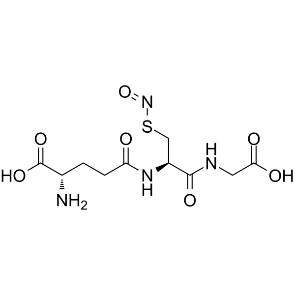DescriptionGSNO is an endogenous transnitrosation donor involved in S-nitrosation of a variety of cellular proteins. GSNO, an exogenous NO donor and substrate of rat alcohol dehydrogenase class III isoenzyme, inhibits cerebral angiotensin II-dependent and -independent AT1 receptor responses.(In Vitro):GSNO completely abolished the AngII-dependent AT1 receptor-mediated vasoconstriction of cerebral arteries. GSNO had no impact on responses to other vasoconstrictors sharing (phenylephrine, U46619) or not (5-HT) the same signalling pathway. (In Vivo):Elevated blood pressure, proteinuria, and intrauterine growth restriction associated with PE were induced in Sprague-Dawley rats using L-NAME. These were partially reversed with the use of GSNO.