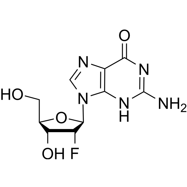 2′-Deoxy-2′-fluoroguanosine is a nucleoside analog that potently inhibits influenza virus A and B strains(EC90 <0.35 μM). 2'-Deoxy-2'-fluoroguanosine is an inhibitor of influenza virus replication in the upper respiratory tract, improving fever and nasal inflammation.