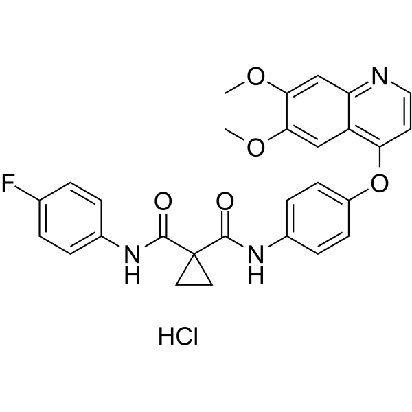 In VitroCabozantinib hydrochloride inhibits phosphorylation of MET and VEGFR2, as well as KIT, FLT3, and AXL with IC50 values of 7.8, 1.9, 5.0, 7.5, and 42 μM, respectively.Cabozantinib hydrochloride (4.6 nM) inhibits tubule formation with no evidence of cytotoxicity, with IC50 values of 6.7, 5.1, 4.1, 7.7, and 4.7 nM in HMVEC, MDA-MB-231, A431, HT1080, and B16F10 cells, respectively.Cabozantinib hydrochloride (0-370 nM, 24 h) inhibits cellular migration and invasion.Cabozantinib hydrochloride (48 h) inhibits tumor cell proliferation in a variety of tumor types.Cell Proliferation Assay Cell Line:SNU-5, Hs746T, SNU-1, SNU-16, MDA-MB-231, U87MG, H441, H69, and PC3 cells Concentration:Incubation Time:48 hours Result:Inhibited tumor cell proliferation, with IC50 of 19, 9.9, 5223, 1149, 6421, 1851, 21700, 20200, and 10800 nM, respectively.Cell Migration Assay Cell Line:B16F10 cells Concentration:0, 41, 123, and 370 nM Incubation Time:24 hours Result:Potently inhibited HGF-induced migration (IC50 = 31 nM) of B16F10 cells.Cell Invasion Assay Cell Line:B16F10 cells Concentration:0, 1.5, 14, and 123 nM Incubation Time:24 hours Result:Potently inhibited HGF-induced invasion (IC50 = 9 nM) of B16F10 cells.