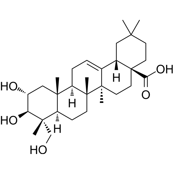 DescriptionArjunolic acid has antioxidant, anti-inflammatory, antinociceptive and anticholinesterasic (AChE and BuChE) activities, it may as promising targets for the development of innovative multi-functional medicines for Alzheimer desease treatment.(In Vitro):The multifunctional therapeutic application of Arjunolic acid has already been documented by its various biological functions including antioxidant, anti-fungal, anti-bacterial, anticholinesterase, antitumor, antiasthmatic, wound healing and insect growth inhibitor activities. The scientific basis behind its therapeutic application as a cardioprotective agent in traditional medicine is justified by its ability to prevent myocardial necrosis and apoptosis, platelet aggregation, coagulation and lowering of blood pressure, heart rate, as well as cholesterol levels. Its antioxidant property coupled with metal chelating property (by its two hydroxyl groups) protects different organs from metal and drug-induced organ pathophysiology. Arjunolic acid also plays a beneficial role in the pathogenesis of diabetes and its associated complications. The mechanism of cytoprotection of Arjunolic acid, at least in part, results from the detoxification of reactive oxygen species (ROS) produced in the respective pathophysiology. In addition to its other biological functions, it also possesses vibrant insecticidal properties and it has the potential to be used as a structural molecular framework for the design of molecular receptors in the general area of supramolecular chemistry and nanochemistry. Esters of Arjunolic acid function as organogelators which has wide application in designing thermochromic switches and sensor devices. Arjunolic acid derived crown ether is an attractive candidate for the design of molecular receptors, biomimetics and supramolecular systems capable of performing some biological functions.