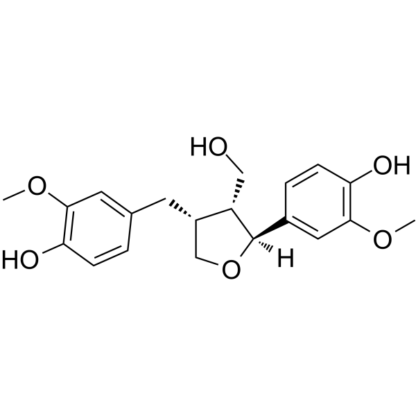 Brief DescriptionLariciresinol is an enterolignan precursor, it possesses fungicidal activities by disrupting the fungal plasma membrane and therapeutic potential as a novel antifungal agent for the treatment of fungal infectious diseases in humans. Dietary lariciresinol can attenuate mammary tumor growth and reduce blood vessel density in human MCF-7 breast cancer xenografts and carcinogen-induced mammary tumors in rats.