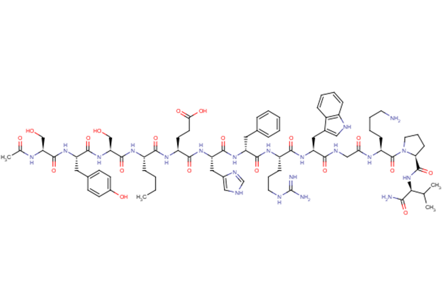 Melanotan-I has the amino acid sequence of Ser-Tyr-Ser-Nle-Glu-His-D-Phe-Arg-Trp-Gly-Lys-Pro-Val and a molecular weight of 1647.4 Dalton.