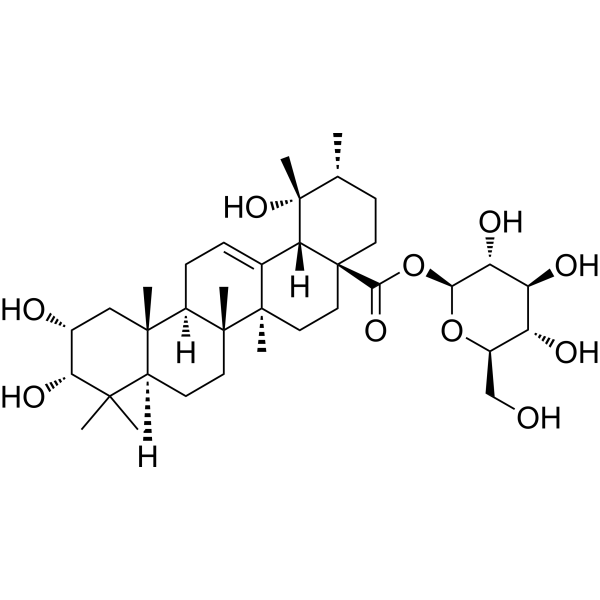 DescriptionKaji-ichigoside F1 shows antiinflammatory/antinociceptive action in acetic acid-induced writhing and hot plate testing and in a carrageenan-induced paw edema model in mice and rats. Kaji-ichigoside F1 exhibits in vivo hepatoprotective effects, it inhibited d-GalN-induced cytotoxicity in primary cultured mouse hepatocytes with the IC50 of14.1uM.