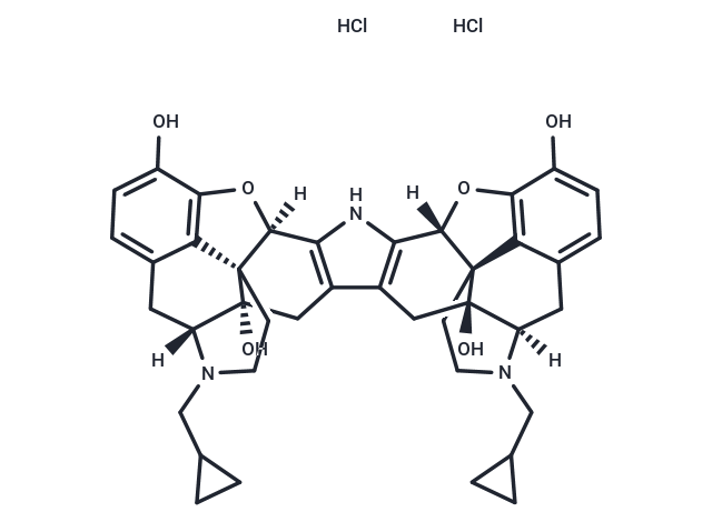 SMILESCl.Cl.[H][C@@]12Oc3c4c(C[C@@]5([H])N(CC6CC6)CC[C@@]14[C@@]5(O)Cc1c4C[C@@]5(O)[C@@]6([H])Cc7ccc(O)c8O[C@@]([H])(c4[nH]c21)[C@]5(CCN6CC1CC1)c78)ccc3O