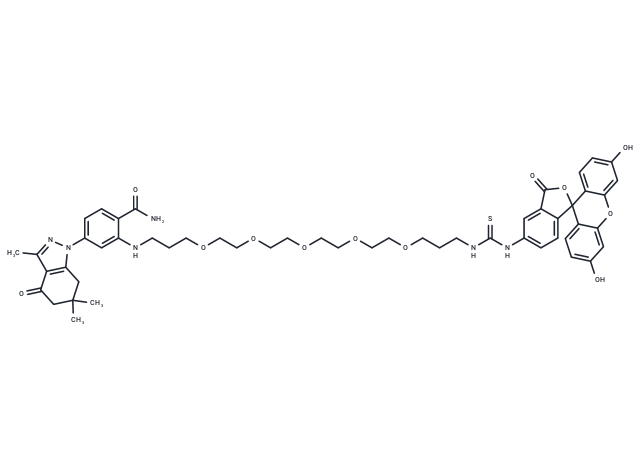 DescriptionHS-27, a fluorescently-tethered Hsp90 inhibitor, assays surface Hsp90 expression on intact tissue specimens. HS-27 is made up of the core elements of SNX-5422, an Hsp90 inhibitor, tethered via a PEG linker to a fluorescein derivative (fluorescein isothiocyanate or FITC), that binds to ectopically expressed Hsp90. HS-27 has potential use in a see-and-treat paradigm in breast cancer.