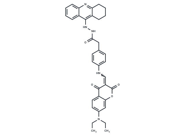 DescriptionPE154 (Compound 13) is a potent fluorescent inhibitor of human acetylcholinesterase (AChE) and butyrylcholinesterase (BChE) (IC50s=280 pM and 16 nM, respectively). PE154 can label β-amyloid plaques in histochemical analysis.