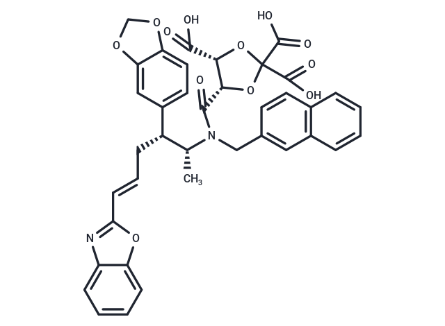 SMILESC(O)(=O)C1(C(O)=O)O[C@H](C(N([C@@H]([C@H](C/C=C/C2=NC=3C(O2)=CC=CC3)C=4C=C5C(=CC4)OCO5)C)CC6=CC7=C(C=C6)C=CC=C7)=O)[C@H](C(O)=O)O1