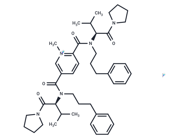 SMILESN([C@H](C(=O)N1CCCC1)C(C)C)(C(=O)C2=C[N+](C)=C(C(N([C@H](C(=O)N3CCCC3)C(C)C)CCCC4=CC=CC=C4)=O)C=C2)CCCC5=CC=CC=C5.[I-]