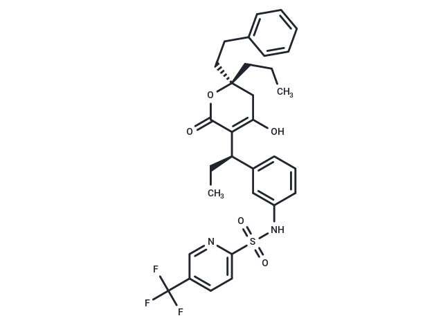 DescriptionTipranavir (PNU-140690) inhibits the enzymatic activity and dimerization of HIV-1 protease, exerts potent activity against multi-protease inhibitor (PI)-resistant HIV-1 isolates with IC50s of 66-410 nM. Tipranavir inhibits SARS-CoV-2 3CLpro activity.