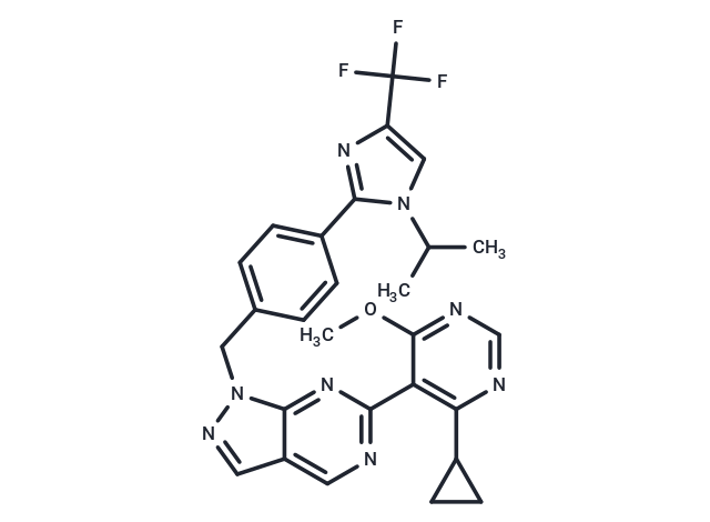 SMILESCOc1ncnc(C2CC2)c1-c1ncc2cnn(Cc3ccc(cc3)-c3nc(cn3C(C)C)C(F)(F)F)c2n1