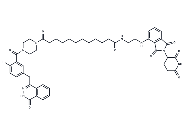 SMILESO=C1NN=C(C=2C=CC=CC12)CC3=CC=C(F)C(=C3)C(=O)N4CCN(C(=O)CCCCCCCCCCC(=O)NCCNC5=CC=CC=6C(=O)N(C(=O)C56)C7C(=O)NC(=O)CC7)CC4