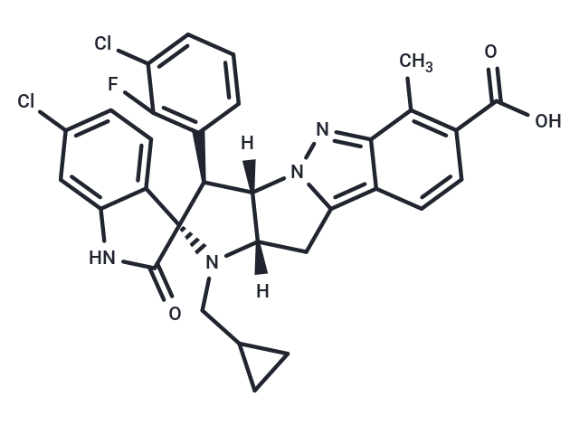 SMILESC(N1[C@@]2([C@H]([C@]3([C@@]1(CC=4N3N=C5C4C=CC(C(O)=O)=C5C)[H])[H])C6=C(F)C(Cl)=CC=C6)C=7C(NC2=O)=CC(Cl)=CC7)C8CC8