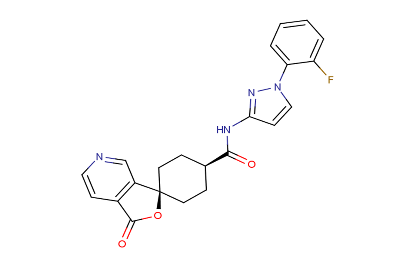 SMILESO=C([C@H]1CC[C@@](C2=C3C=CN=C2)(OC3=O)CC1)NC4=NN(C5=CC=CC=C5F)C=C4