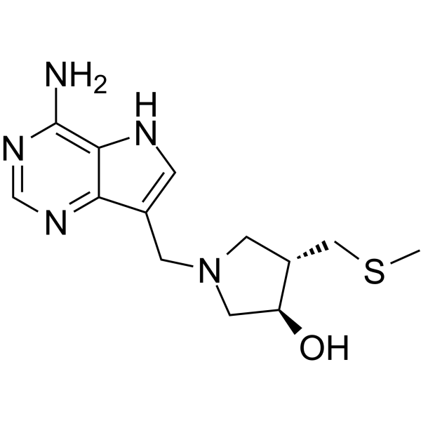 DescriptionMT-DADMe-ImmA is an inhibitor of human 5'-methylthioadenosine phosphorylase (MTAP, Ki: 90 pM).(In Vitro):Treatment of cultured cells with MTA and MT-DADMe-ImmA inhibit MTAP, increase cellular MTA concentrations, decrease polyamines, and induce apoptosis in FaDu and Cal27, two head and neck squamous cell carcinoma cell lines. MT-DADMe-ImmA alone does not induce apoptosis in any cell line .(In Vivo):MTAP activity slowly returns, giving a biological half-life for the action of oral MT-DADMe-ImmA of 6.3 days. The time-dependent growth of FaDu tumors in immunodeficient mice is suppressed by oral or intraperitoneal treatment with MT-DADMe-ImmA .
