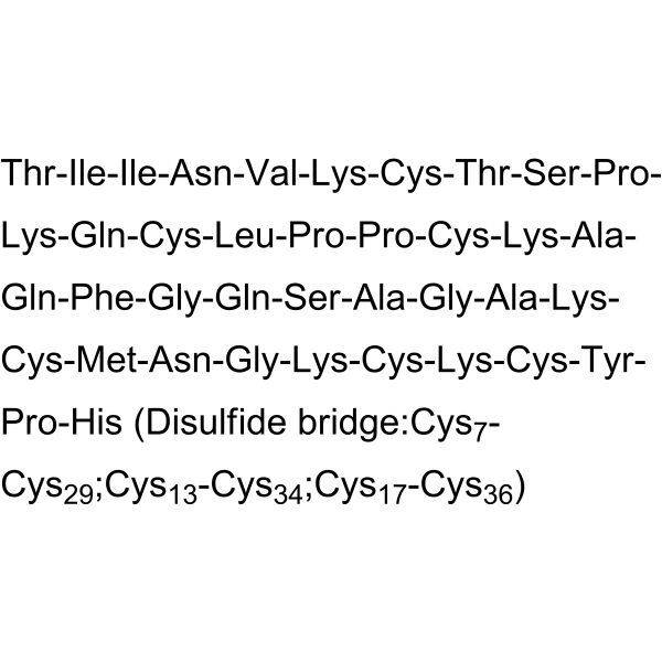 Brief DescriptionPotent KV1.3 channel blocker (IC50 = 36 pM). Displays no effect at calcium-activated channels. Reduces VEGF-induced transmembrane calcium influxes and nitric oxide production in human endothelial cells.