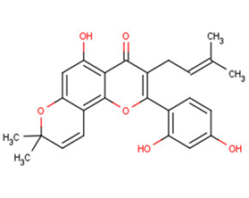 In VitroMorusin exhibits a dose- and time-dependent inhibitory effect on murine and human breast cancer cells. IC50 is 9.48 μg/mL for normal mammary epithelial cells (MCF-10A); 2.03 and 1.87 μg/mL for murine breast cancer cells (4 T1 and EMT6); and 2.71 and 3.86 μg/mL for human breast cancer cells (MCF-7 and MDA-MB-231), respectively, the maximal inhibition of cell growth (>80 %) is obtained at 8 μg/mL. The apoptotic cells in morusin treated breast cancer cells are increased significantly in a dose-dependent manner. Morusin significantly inhibits the growth and clonogenicity of human colorectal cancer HT-29 cells. Morusin also inhibits the phosphorylation of IKK-α, IKK-βand IκB-β, increases expression of IκB-α, and suppresses nuclear translocation of NF-κB and its DNA binding activity. Dephosphorylation of NF-κB upstream regulators PI3K, Akt and PDK1 is also displayed. In addition, activation of caspase-8, change of mitochondrial membrane potential, release of cytochrome c and Smac/DIABLO, and activation of caspase-9 and -3 are observed at the early time point. Downregulation in the expression of Ku70 and XIAP is exhibited afterward. Morusin suppresses viability of prostate cancer cells, but little effect in normal human prostate epithelial cells. Morusin also reduces STAT3 activity by inhibiting its phosphorylation, nuclear accumulation, and DNA binding activity. In addition, morusin down-regulated expression of STAT3 target genes encoding Bcl-xL, Bcl-2, Survivin, c-Myc and Cyclin D1. It induces apoptosis in human prostate cancer cells by reducing STAT3 activity.