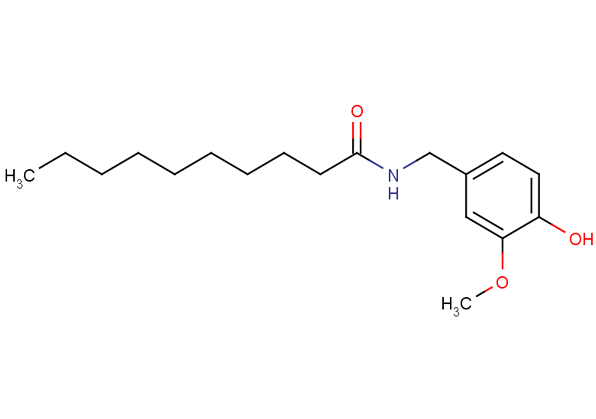 Brief DescriptionN-Vanillyldecanamide is a capsaicinoid isolated from the fruits of Capsicum annuum. It significantly reduced the radical length of Lactuca sativa seedling in a dose-dependent manner.