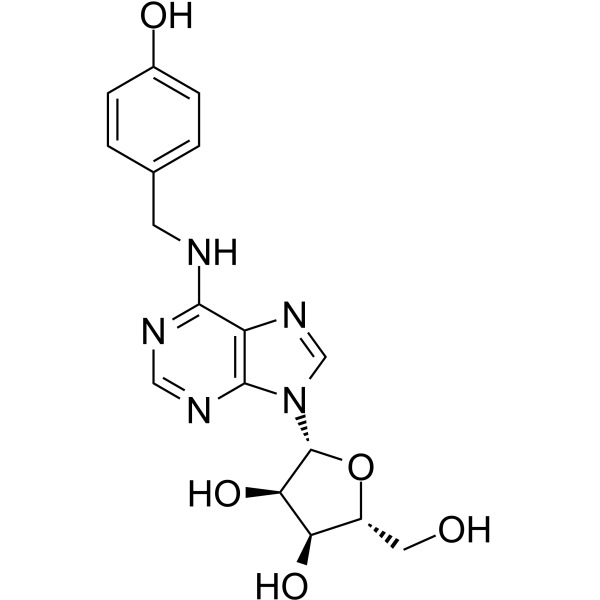 DescriptionN6-(4-Hydroxybenzyl)adenosine is a platelet aggregation inhibitor.(In Vitro):A few naturally occurring N(6)-substituted adenosine derivatives (cytokinin ribosides) were investigated as inhibitors of platelet aggregation induced in vitro by collagen and their activity range was demonstrated (IC50: 6.77-141 μM).