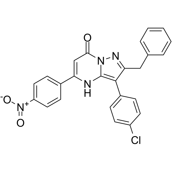 SMILES[O-][N+](=O)c1ccc(cc1)-c1cc(=O)n2nc(Cc3ccccc3)c(-c3ccc(Cl)cc3)c2[nH]1