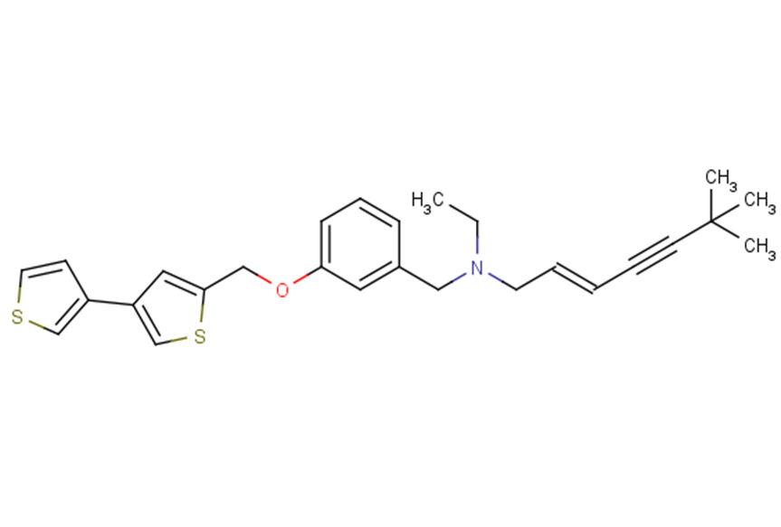 DescriptionNB-598 is an effective and competitive inhibitor of squalene epoxidase. It suppresses triglyceride biosynthesis through the farnesol pathway.NB-598 (10 μM) inhibits the synthesis of sterol and sterol ester from [14C]acetate without affecting the synthesis of other lipids such as phospholipids (PL), free fatty acids (FFA) and triacylglycerol (TG). In the absence of exogenous liposomal cholesterol, NB-598 reduces ACAT activity by 31%. NB-598 reduces ACAT activity by 22% even in the presence of a 600 pM concentration of liposomal cholesterol. NB598 (10 μM) causes a 36±7% reduction in the total cholesterol level of MIN6 cells. NB598 causes a significant decrease in cholesterol by 49±2%, 46±7%, and 48±2% from PM, ER, and SG, respectively. NB598 dose-dependently inhibits insulin secretion under both basal (1 mM glucose) and glucose-stimulated (16.7 mM glucose) conditions. NB598 at concentrations up to 10 μM does not affect peak outward KV currents or the voltage dependence of activation but increases current inactivation.