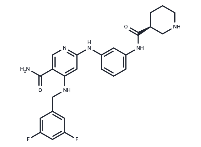 SMILESN(CC1=CC(F)=CC(F)=C1)C=2C(C(N)=O)=CN=C(NC3=CC(NC(=O)[C@H]4CCCNC4)=CC=C3)C2