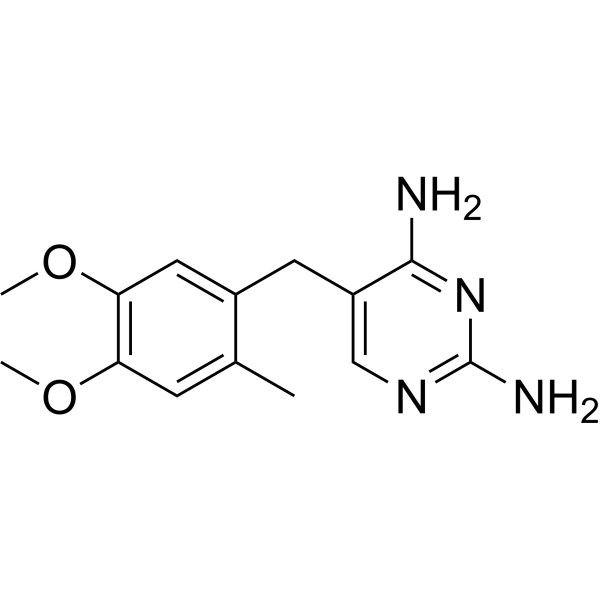 DescriptionOrmetoprim, an antibiotic approved for use in the United States, is used to prevent the spread of disease in freshwater aquaculture.(In Vivo):Ormetoprim (8.3 mg/kg; i.p.) exhibits absorption half-life (5.4 h), elimination half-life (7.5 h) and Cmax (1.2±0.2 μg/mL).Ormetoprim (8.3 mg/kg; p.o.) exhibits absorption half-life (3.9 h), elimination half-life (3.9 h), Cmax (1.6±0.4 μg/mL) and oral availability (78.5%) relative to intraperitoneal administration.