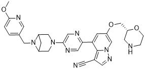 SMILESN#CC1=C2C(C3=NC=C(N4CC(C5)N(CC6=CC=C(OC)N=C6)C5C4)N=C3)=CC(OC[C@H]7CNCCO7)=CN2N=C1