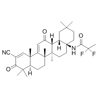 DescriptionA potent Nrf2 activator that increases expression of Nrf2 target genes and decreases expression of inflammatory mediators; dose-dependently reduces NO concentrations with IC50 value of 4.4±1.8 nM in RAW 264.7 cells; also increases p21 levels and JNK phosphorylation.Other Indication Phase 2 Clinical(In Vitro):To evaluate the anti-inflammatory activity of Omaveloxolone (RTA 408), RAW 264.7 mouse macrophage cells are treated with Omaveloxolone for two hours and then IFNγ is added to stimulate NO production and release into the media. Omaveloxolone dose-dependently reduces NO concentrations in the media with an IC50 value of 4.4±1.8 nM. The potency of Omaveloxolone in this assay is similar to that of Bardoxolone methyl, which has an IC50 value of 1.9±0.8 nM. Nrf2 activation is required for AIM-mediated NO suppression. A decrease in nitric oxide synthase 2 (Nos2) protein levels is observed in bardoxolone methyl-treated RAW 264.7 cells, which is attenuated when Nrf2 mRNA levels are reduced by siRNA. To evaluate the anticancer activity of Omaveloxolone, a panel of eight human cell lines derived from tumors of different origin are treated with Omaveloxolone and measured cell growth 72 hours later using the sulforhodamine B (SRB) assay. Omaveloxolone inhibits the growth of all tumor lines with an average GI50 value of 260±74 nM. To determine whether Omaveloxolone induces apoptosis, the panel of tumor cells are treated with Omaveloxolone and the caspase substrate, DEVD-AFC, for 24 hours. Omaveloxolone dose-dependently increases DEVD-AFC cleavage, indicating that Omaveloxolone treatment triggers caspase activation in cancer cells. Caspase-3 and caspase-9 cleavage is also observed by western blot at the same concentrations of Omaveloxolone that increases DEVD-AFC cleavage.(In Vivo):To determine whether Omaveloxolone (RTA-408) is an effective mitigator of hematopoietic acute radiation syndrome after bone marrow-lethal doses of total-body irradiation (TBI), mice are administered 3 daily injections of 17.5 mg/kg Omaveloxolone beginning 24 h after TBI. Teatment with Omaveloxolone results in the 35 day survival of 100% of 7 Gy (LD40/35) TBI mice (P<0.05) and 60% of 7.5 Gy (LD100/13) TBI mice (P<0.0001).