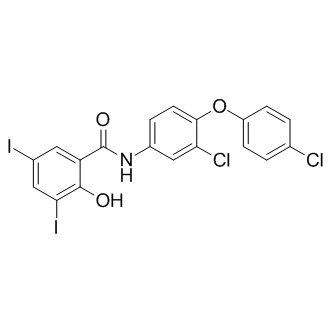 DescriptionA salicylanilide anthelmintic agent that also shows to be an allosteric inhibitor of SPAK and OSR1; has antiangiogenic activity in zebrafish with IC50 of 1.69 uM on the intersegmental vessels and 1.45 uM on the subintestinal vessels.Parasite Infection Approved.