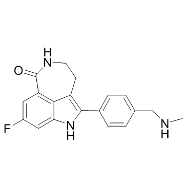 DescriptionAn inhibitor of PARP with Ki of 1.4 nM for PARP1 in a cell-free assay, also showing binding affinity to eight other PARP domains; inhibits PARP-1 activity by 97.1% at a concentration of 1 μM in permeabilised D283Med cells; enhances the antitumor activity of temozolomide and indicates complete and sustained tumor regression in NB1691 and SHSY5Y xenografts.Ovarian Cancer Approved(In Vitro):Rucaparib (AG014699) is a possible N-demethylation metabolite of AG14644.Rucaparib (0.1, 1, 10, 100 μM; 24 hours) is cytotoxic and has the LC50 being 5 μM in Capan-1 (BRCA2 mutant) cells and only 100 nM in MX-1 (BRCA1 mutant) cells.The radio-sensitization by Rucaparib is due to downstream inhibition of activation of NF-κB, and is independent of SSB repair inhibition. Rucaparib can target NF-κB activated by DNA damage and overcome toxicity observed with classical NF-κB inhibitors without compromising other vital inflammatory functions.Rucaparib inhibits PARP-1 activity by 97.1% at a concentration of 1 μM in permeabilised D283Med cells.(In Vivo):Rucaparib (AG014699) and AG14584 significantly increase Temozolomide toxicity. Rucaparib (1 mg/kg) significantly increases Temozolomide-induced body weight loss. Rucaparib (0.1 mg/kg) results in a 50% increase in the temozolomide-induced tumor growth delay.Rucaparib (10 mg/kg for i.p. or 50, 150 mg/kg for p.o.; daily for 5 days per week for 6 weeks) significantly inhibits the growth of the tumor, and there is one complete tumor regression and two persistent partial regressions.Rucaparib (150 mg/kg; p.o.; once per week for 6 weeks or three times per week for 6 weeks) has greatest antitumor effect with three complete regressions.Rucaparib enhances the antitumor activity of temozolomide and indicates complete and sustained tumor regression in NB1691 and SHSY5Y xenografts.