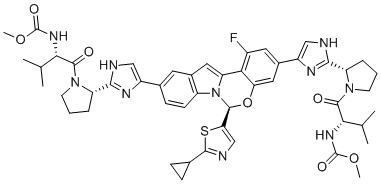 Chemical NameDimethyl N,N'-([(6S)-6-(2-cyclopropyl-1,3-thiazol-5-yl)-1-fluoro-6H-indolo[1,2-c][1,3]benzoxazine-3,10-diyl]bis{(1H-imidazole-4,2-diyl)[(2S)-pyrrolidine-2,1- diyl][(2S)-3-methyl-1-oxobutane-1,2-diyl]})dicarbamate