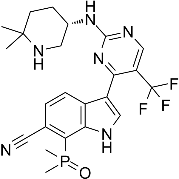 DescriptionCDK7-IN-3 is a selective CDK7 inhibitor with a KD of 0.059 nM. CDK7-IN-3 shows poor inhibition on CDK2 (Ki=390 nM), CDK9 (Ki=290 nM), CDK12 (Ki=78 nM). CDK7-IN-3 induce apoptosis in tumor cells and has antitumor activity.(In Vitro):SY-5609 (126.4 pM-4 μM) has an EC50 of 5.6 nM in the HCC70 cell line. SY-5609 (0.01-10000 nM) exhibits strong antiproliferative effects with IC50s of 1-6 nM in triple-negative breast cancer and ovarian cancer cells including HCC70, MDA-MB453, COV504, A2780, OVCAR3, CAOV3 cells. SY-5609 (100-500 nM) induces apoptosis in HCC70, MDA-MB-468, CAOV3, and OVCAR3 cells. In HCC70 cells, SY-5609 (100-500 nM) induces G2/M cell cycle arrest. SY-5609 (25-500 nM) inhibits the phosphorylation of CDK2 at Thr160 via loss of CAK function.(In Vivo):In Balb/c nude female mice with HCC70 cell lines, SY-5609 (2 mg/kg/day; orally) induces tumor regression with a plasma exposure of 261.28 ng h/mL, a Cmax of 50.67 ng/mL and an elimination half-life of 3.33 h.