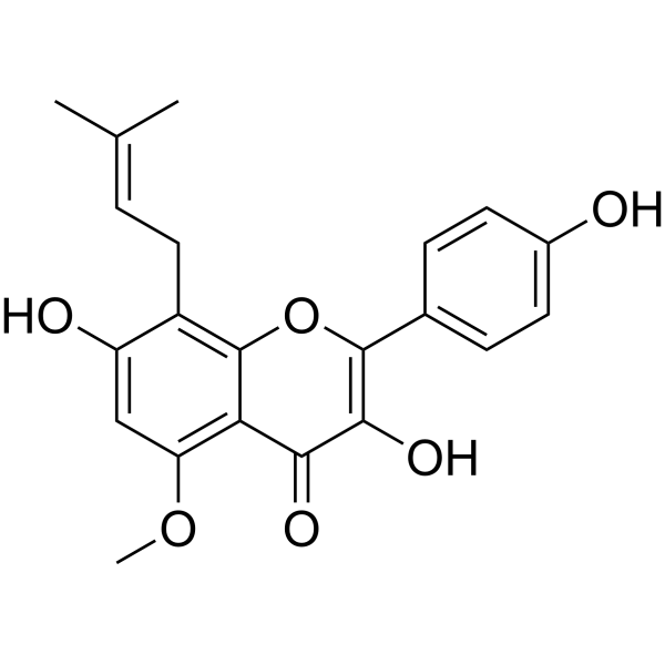 DescriptionSophoflavescenol is a mixed inhibitor of PDE5 with a K(i) value of 0.005 microM. Sophoflavescenol has antioxidant, anti-inflammatory, and apoptotic effects , these effects might contribute to the antitumor activity without severe side effects. Sophoflavescenol exerts notable anti-inflammatory activity by inhibiting nitric oxide generation and tert-butylhydroperoxide-induced ROS generation rather than inhibiting nuclear factor kappa B activation in RAW 264.7 cells.(In Vitro):Despite the small effect on human breast adenocarcinoma (MCF-7), Sophoflavescenol showed cytotoxicity against human leukaemia (HL-60), Lewis lung carcinoma (LLC), and human lung adenocarcinoma epithelial (A549) cells. Interestingly, it also exerted potent in vivo antitumor activity by tumor growth inhibition in the LLC tumor model as well as apoptotic activity by caspase-3 activation in HL-60 cells. In addition, it exhibited potent antioxidant activities in 1,1-diphenyl-2-picrylhydrazyl, 2,2'-azino-bis(3-ethylbenzothiazoline-6-sulfonic acid) diammonium salt radicals and lipid peroxidation assays. Sophoflavescenol exerted notable anti-inflammatory activity by inhibiting nitric oxide generation and tert-butylhydroperoxide-induced ROS generation rather than inhibiting nuclear factor kappa B activation in RAW 264.7 cells.