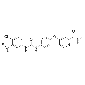 DescriptionA potent, orally available Raf inhibitor with IC50 of 6, 22, and 38 nM for Raf-1, wt Braf, and BRaf V599E, respectively; Also demonstrates potent inhibition of certain proangiogenic RTKs, including VEGFR-2, PDGFR-β, VEGFR-3, Flt-3, c-Kit (IC50<100 nM); Exhibits broad spectrum oral antitumor activity and targets the RAF/MEK/ERK pathway and receptor tyrosine kinases involved in tumor progression and angiogenesis.Kidney Cancer Approved(In Vitro):Sorafenib (BAY 43-9006) also inhibits BRAFwt (IC50=22 nM), BRAFV599E (IC50=38 nM), VEGFR-2 (IC50=90 nM), VEGFR-3 (IC50=20 nM), PDGFR-β (IC50=57 nM), c-KIT (IC50=68 nM), and Flt3 (IC50=58 nM) in biochemical assays. In MDA-MB-231 breast cancer cells, Sorafenib completely blocks activation of the MAPK pathway. Cells are preincubated with Sorafenib (0.01 to 3 μM), and dose-dependent inhibition of basal MEK 1/2 and ERK 1/2 phosphorylation (IC50, 40 and 100 nM, respectively). (In Vivo):Sorafenib demonstrates broad oral antitumor efficacy in panel of human tumor xenograft models. Sorafenib is given orally at 7.5 to 60 mg/kg. There is no lethality and no increase in weight loss in any treated group relative to the corresponding control group. Daily oral administration of Sorafenib (30 to 60 mg/kg) produces complete tumor stasis during treatment in five of the six models. The survival rate is 73.3 % in Diethyl nitrosamine (DENA) group and 83.3 % in Sorafenib group compared to 100 % in the normal control group. DENA group shows a significant increase in liver index (1.51-fold increase, p<0.05) compared to normal control group, while treatment with Sorafenib shows significant decrease (p<0.05) in liver index when compared to DENA group. The liver index in Sorafenib group significantly decreases to lower than its value in the normal control.