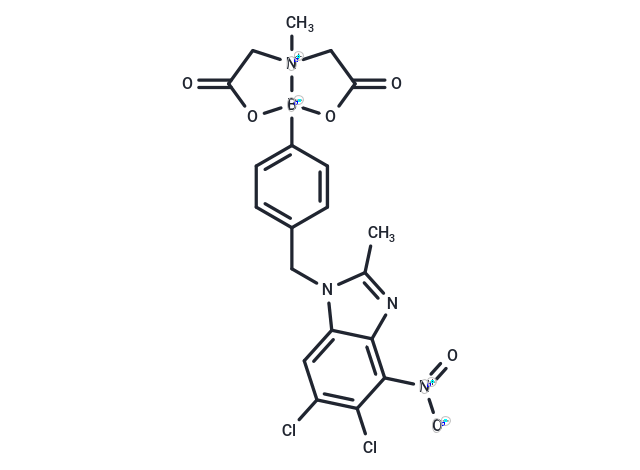 SMILESCc1nc2c(c(Cl)c(Cl)cc2n1Cc1ccc(cc1)[B-]12OC(=O)C[N+]1(C)CC(=O)O2)[N+]([O-])=O