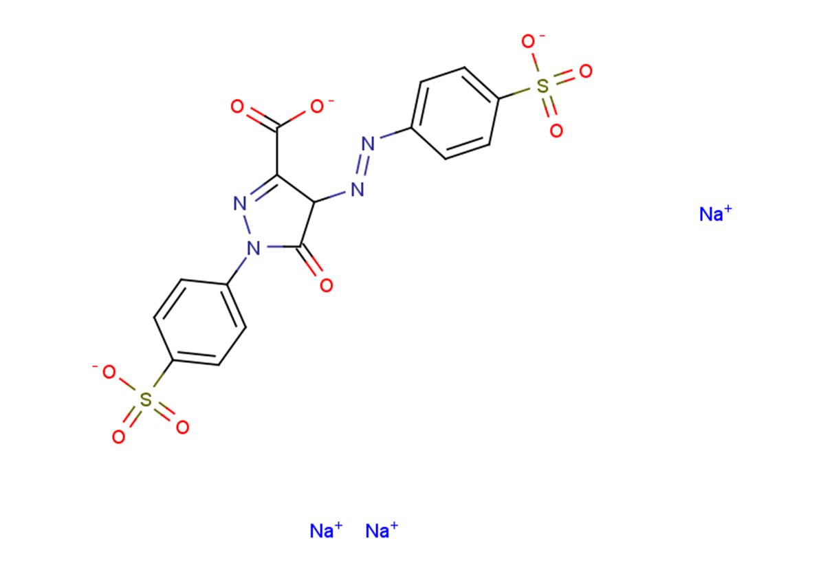 SMILESO=C([O-])C(C1/N=N/C2=CC=C(C=C2)S(=O)([O-])=O)=NN(C1=O)C3=CC=C(C=C3)S(=O)([O-])=O.[Na+].[Na+].[Na+]