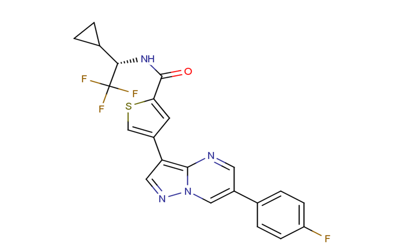 SMILESO=C(C1=CC(C2=C3N=CC(C4=CC=C(F)C=C4)=CN3N=C2)=CS1)N[C@@H](C5CC5)C(F)(F)F