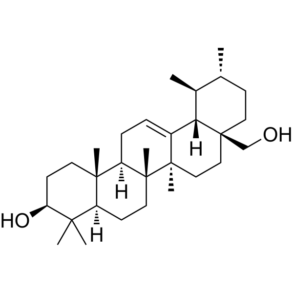 DescriptionUvaol is present in olives and virgin olive oil with anti-inflammatory, anti-proliferative, and vasorelaxant activities.(In Vitro):Uvaol decreased collagen I and galectin 3 levels induced by angiotensin II in cardiac myofribroblasts. Uvaol attenuates pleuritis and eosinophilic inflammation in ovalbumin-induced allergy in mice.