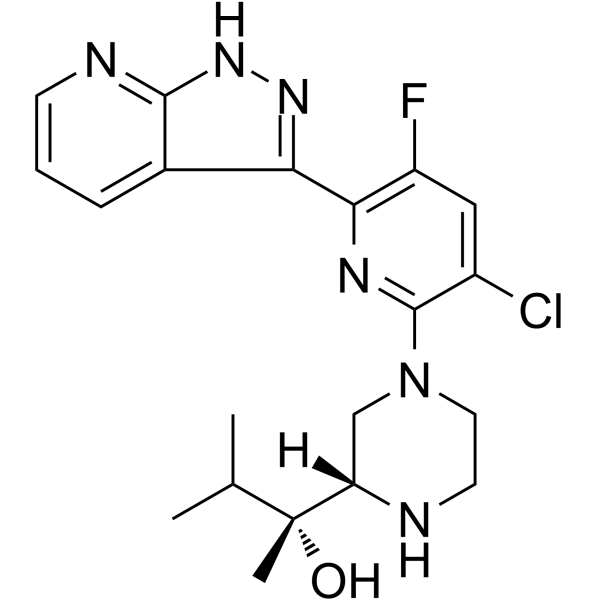 SMILES[H][C@]1(CN(CCN1)c1nc(-c2n[nH]c3ncccc23)c(F)cc1Cl)[C@](C)(O)C(C)C
