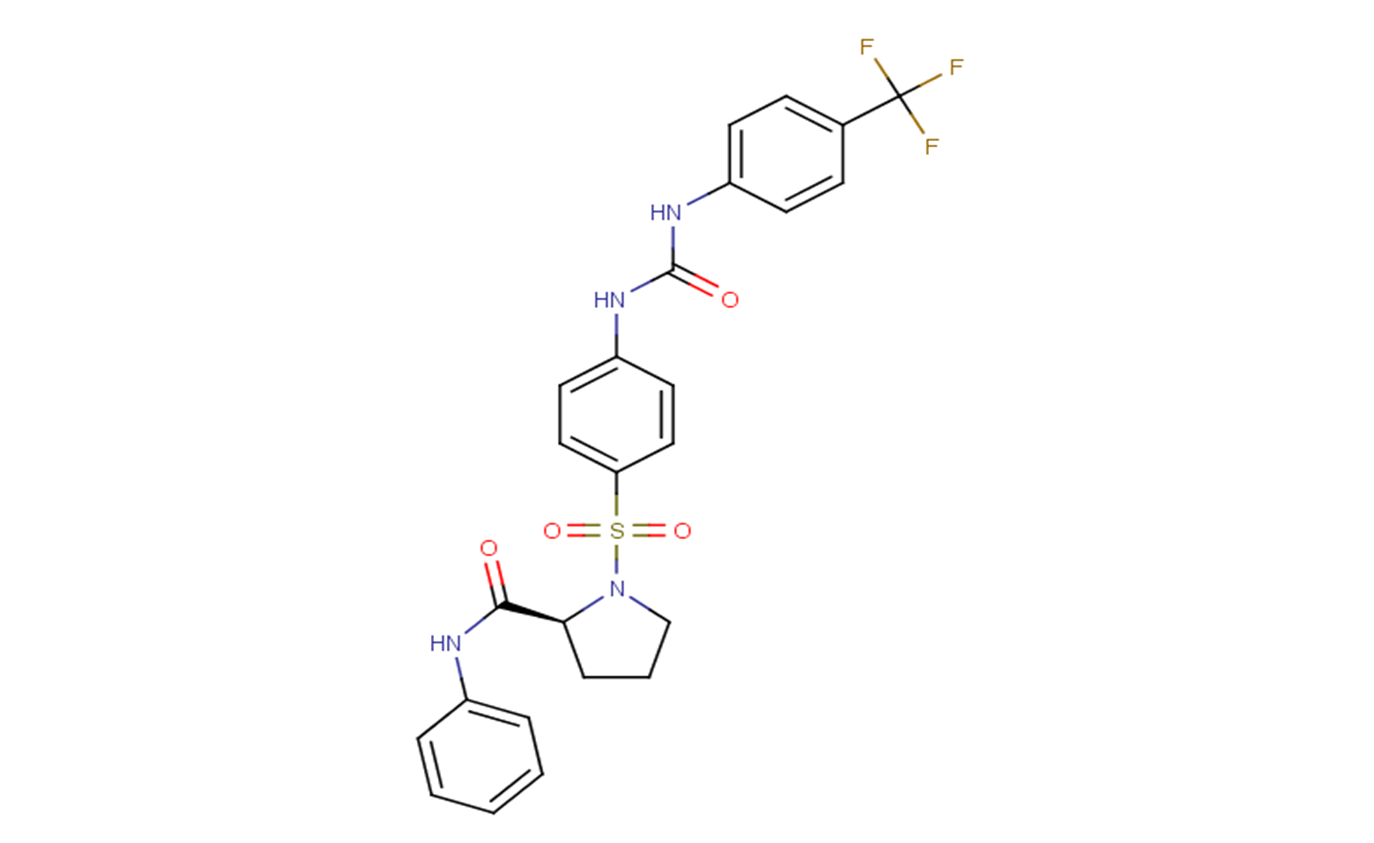 SMILESC1C[C@H](N(C1)S(=O)(=O)C2=CC=C(C=C2)NC(=O)NC3=CC=C(C=C3)C(F)(F)F)C(=O)NC4=CC=CC=C4